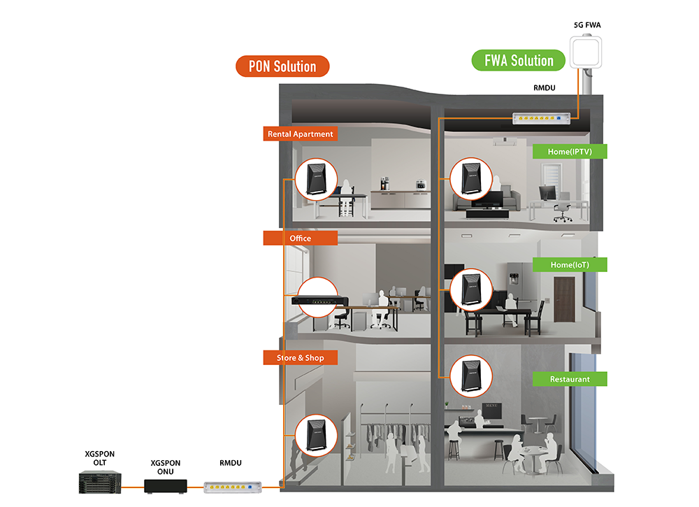 COMTREND’s R-MDU fits all requirements in time, spread out quickly by connecting 5G FWA ODU for today, and XGS-PON ONU for coming future.